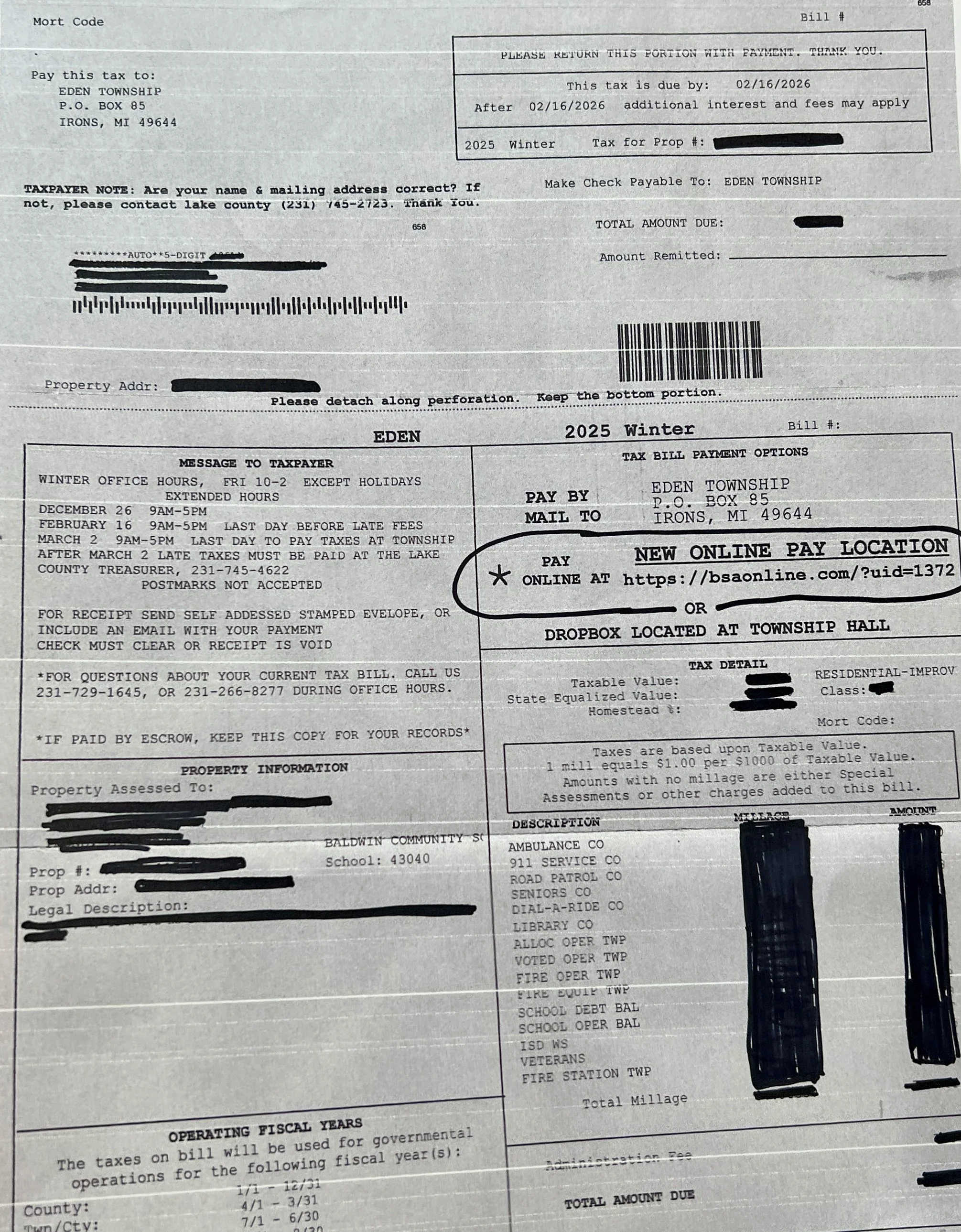 Should you have any questions regarding your taxes, please call (231) 266-8277 or (231) 729-1645 before the due date. Late taxes are subject to county regulated penalties.